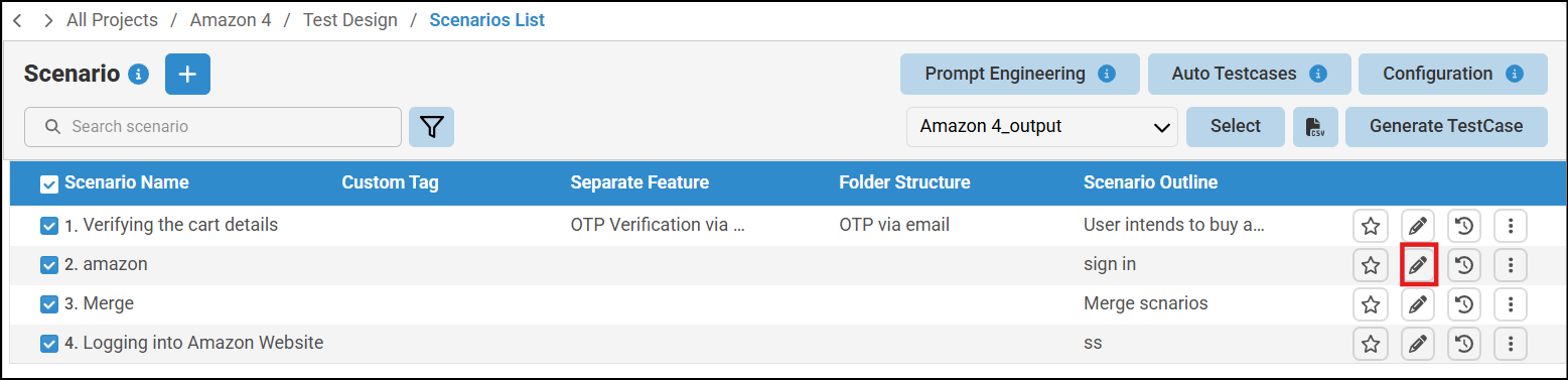 - Navigate to the Scenario List from which you want to copy the Scenario Steps List, then click the Edit icon next to the relevant scenario.
