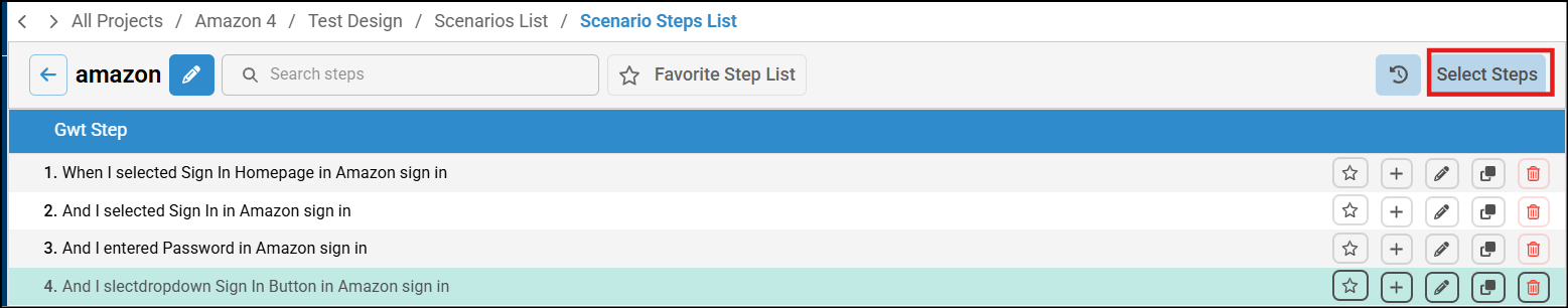 You can update an existing GWT step or add a new one by adding alias step by clicking on edit icon besides GWT step in Scenario Steps List. Now there is auto suggestions available for re-using Alias Step