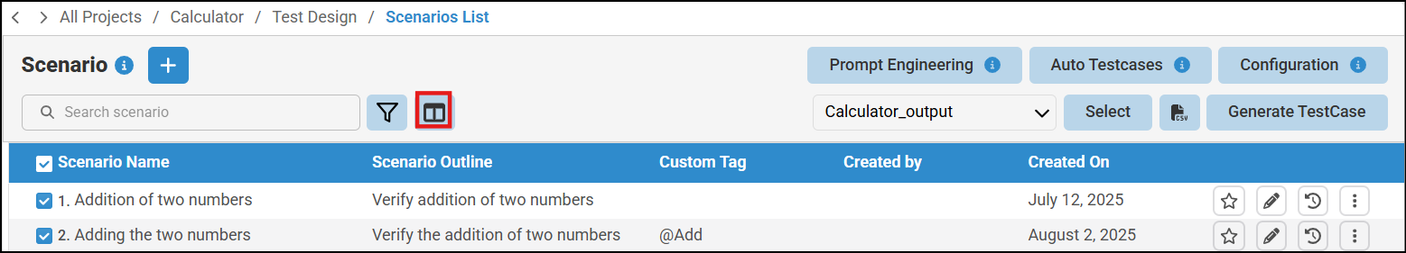 Test Design screen allows you to access and manage scenarios more efficiently. You will be able to view, add, search, filter and reset the scenarios.