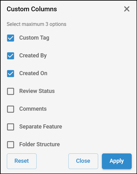 - Select the items you want to view like Custom Tag, Created By, Created On, Review Status, Comments, Separate Feature, Folder Structure and click Apply.