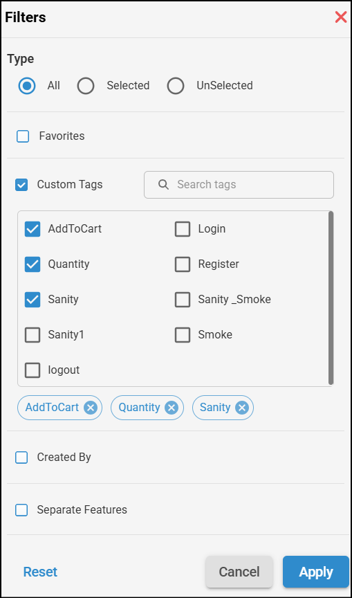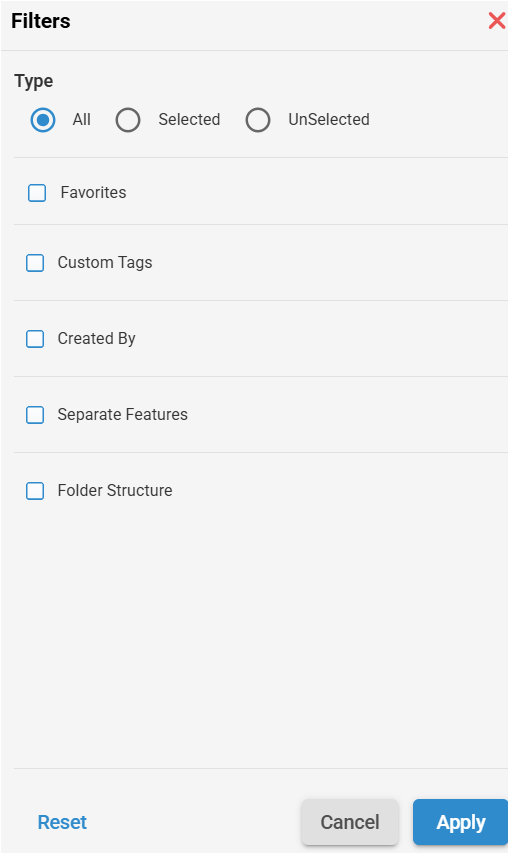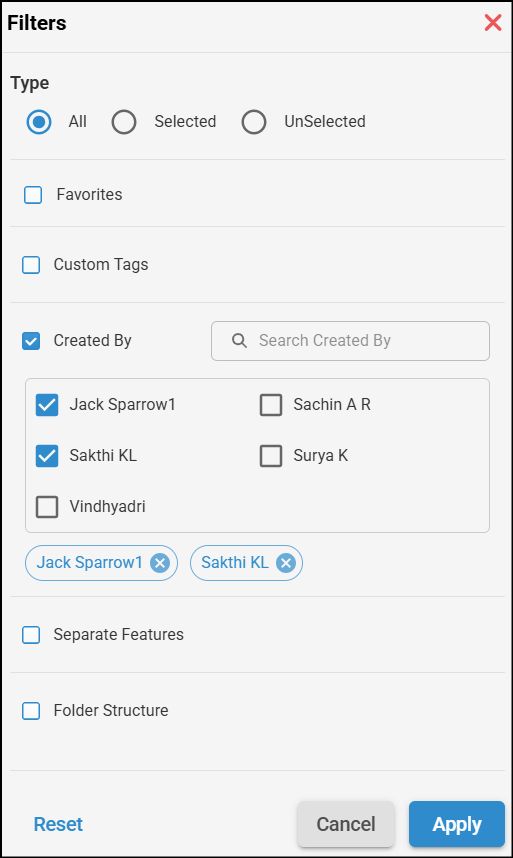 - Categories: You can utilize a range of categories to filter by selecting the checkbox besides the category like:- Favorites, Custom Tags, Separate Features and Folder Structure.