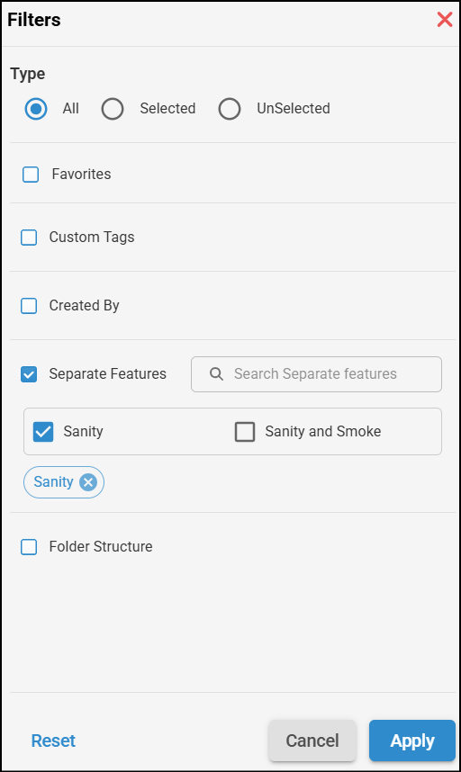 When you select the Separate Features checkbox, all the features which are created using Separate features will be displayed. You can then choose a features you want to filter by and apply the selection.