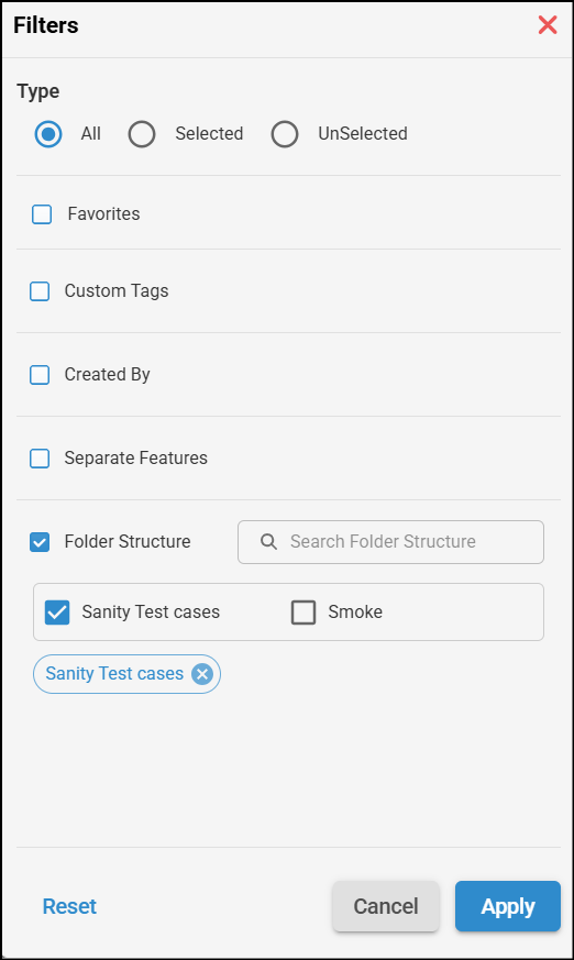 When you select the Folder Structure checkbox, all the folder structure which are created using Folder structure feature will be displayed. You can then choose a folder structure you want to filter by and apply the selection.