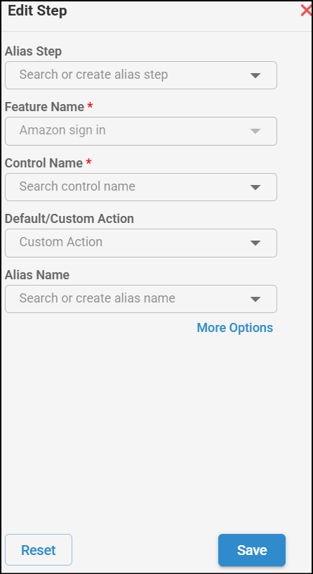 - In the Scenario Steps List, click plus icon to add a new step, select the appropriate feature, control type from the dropdown list. Click on save and save the changes. You can click on More Options to add alias step and required details. Refer to the next section.
