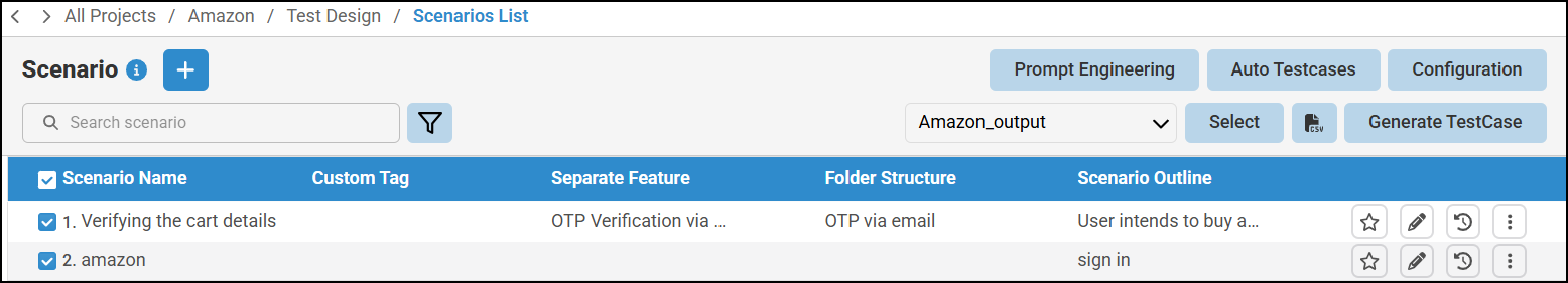 - To edit scenario, you can use edit icon located besides the ‘More Actions’ menu in the Scenarios List and Scenario Steps List, click on edit icon which is available between scenario name and search field, you can rename a Scenario Name. Once you've made changes, click on update button.