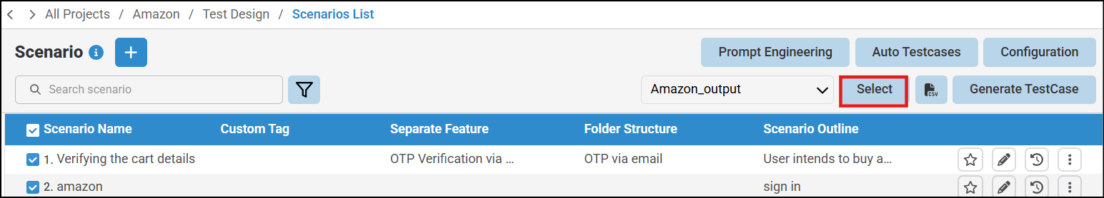 You can view and search a comprehensive list of scenarios using scenario names, custom tags, outlines, features, and structure.