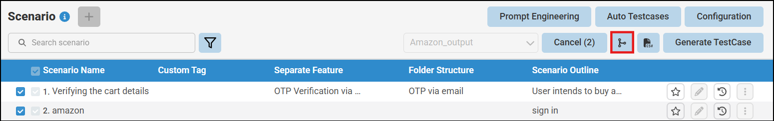 The Merge Scenarios option in the Scenario List allows you to merge scenarios. The GWT steps in the merged scenario are ordered sequentially, with the steps from the first scenario appearing first, followed by the steps from the second scenario.
