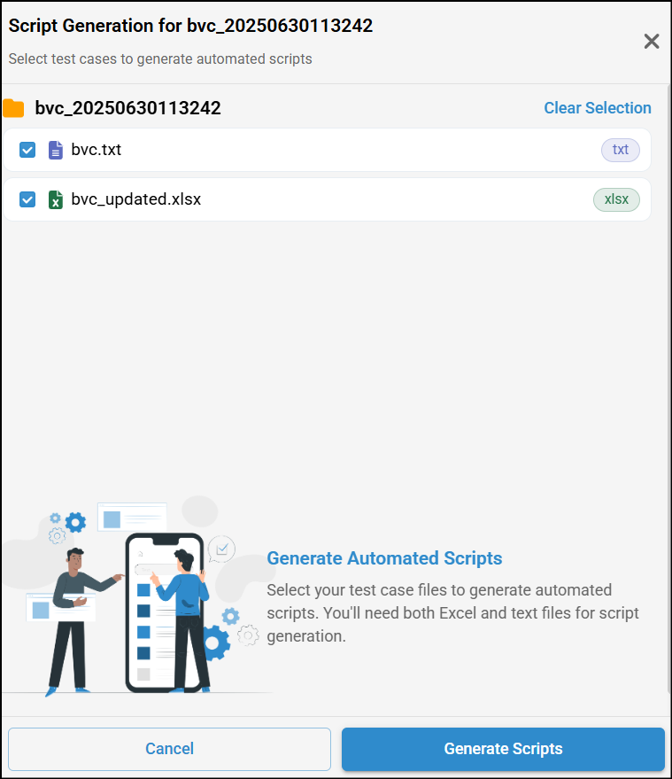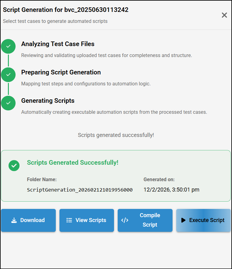 - This will analyze the test cases by default and Scripts will be generated. Scripts can be viewed and downloaded by clicking on appropriate button.