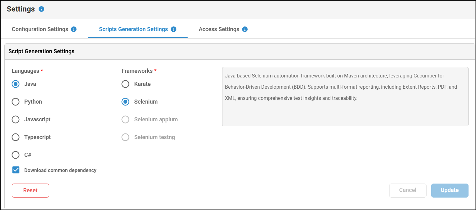 | Requirement Filter | Check this check box to generate a separate Feature file, folder structure and update. For more information, see Generating separate Feature File in separate folder. |