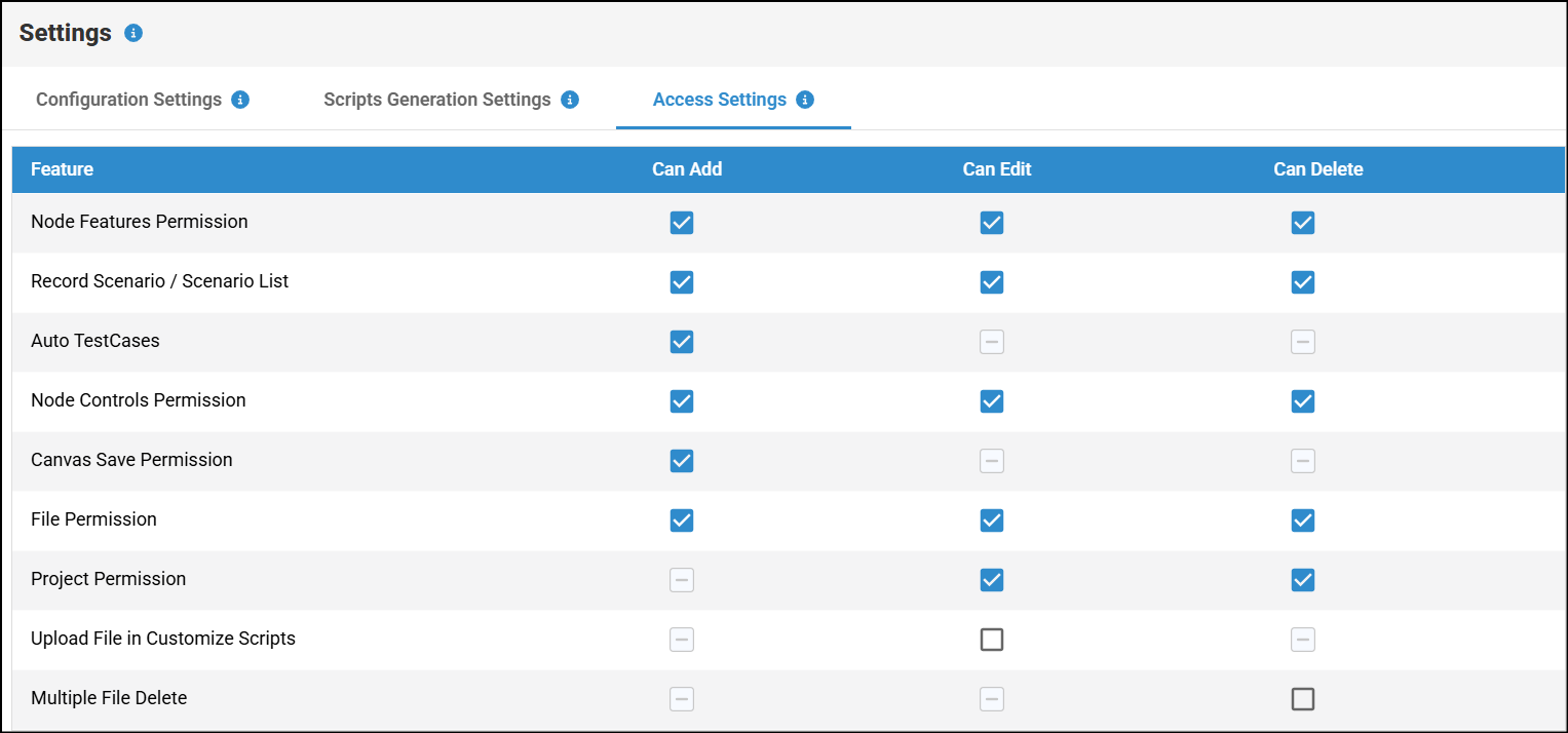Additionally, you can provide access to the user to add, edit and delete a test case in the Edit Scenario window.Auto Generate Test Cases As an admin, you can assign or unassign access to the user to use Auto Generate Test cases feature by enabling and disabling this feature. Node Controls Permission As an admin, you can assign access to a user to add, edit and delete a UI element (control) associated to a feature. Canvas Save Permission As an admin, you can assign or unassign access to a user to save the modifications made in Canvas. File Permission As an admin, you can remove access to a user to upload or create any file. Upload file or create file option will be disabled for a particular project. As a user, you will be still be able to edit and delete an uploaded or created file. Additionally, as an admin, you can also restrict the access to edit and delete a file by removing access to edit and delete options. Project Permission As an admin, you can remove access to a user to delete a created project. Delete button will be disabled when you access as a user. Also as an admin, you can remove access to a user to edit a project. Udpdate button of project settings will be disabled when you access as a user. Upload Script Permission As an admin, you can grant a user access to edit the generated scripts for a specific project. Multiple Files Delete Permission As an admin, you can assign access to a user to delete multiple files from the project folder. By default, Delete all option will be disabled to prevent any