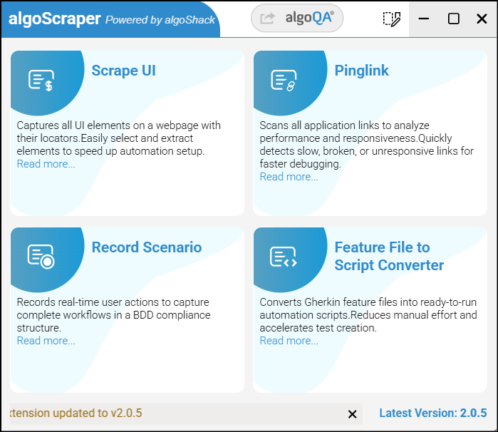 For more information on usage of this extension, refer to Using algoScraper in the Developer Tools Panel. If right click functionality is disabled in webpage then you can use Record Scenario feature to scrape the XPaths as you perform the action. To know more about Record Scenario feature, refer to Record a Scenario Using Online Recorder. You can also use algoScraper in Developer Tools Panel. When there is a update in algoScraper, the algoScraper which is in your machine gets updated automatically. The latest version of algoScraper is 2.0.5.
