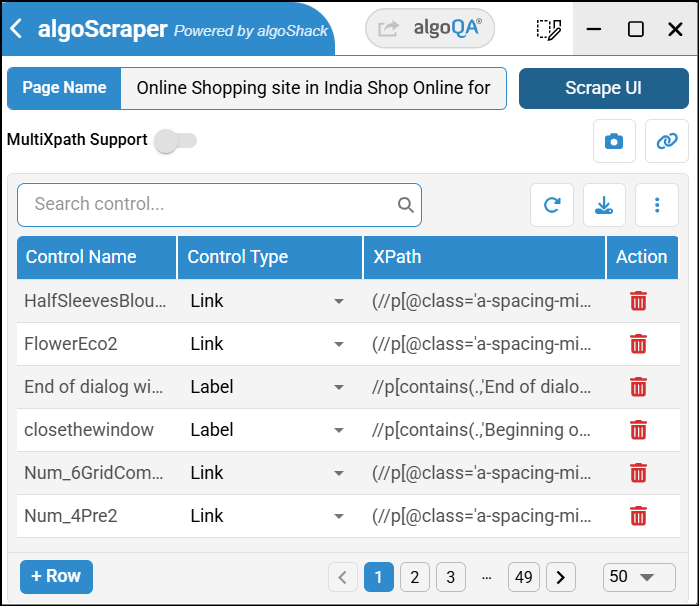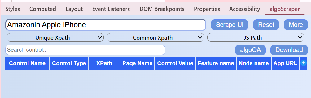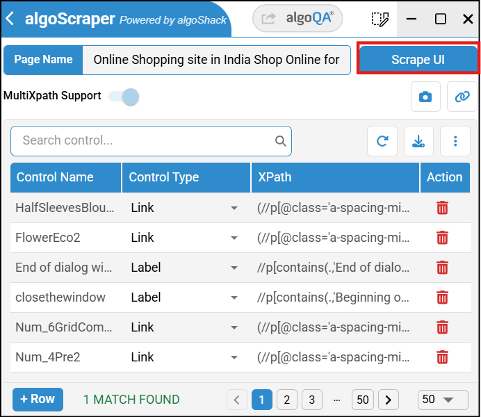 - Open the application and if you wish to scrape the entire page at one go, click the extension on your application described in the prerequisite to view the algoScraper window and click Scrape UI button. All the UI element details with corresponding XPath expression of the scraped UI page details will be listed. Upon successful completion, you will see the Scraping completed message.