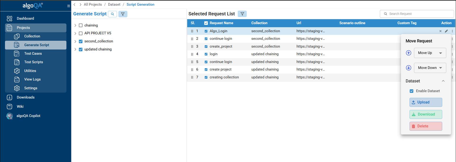 In the API generate script screen, Once you select a collection by default Selected Request List will be selected, Check Data Set option and click Generate Script. After generating the scripts, click More Menu (