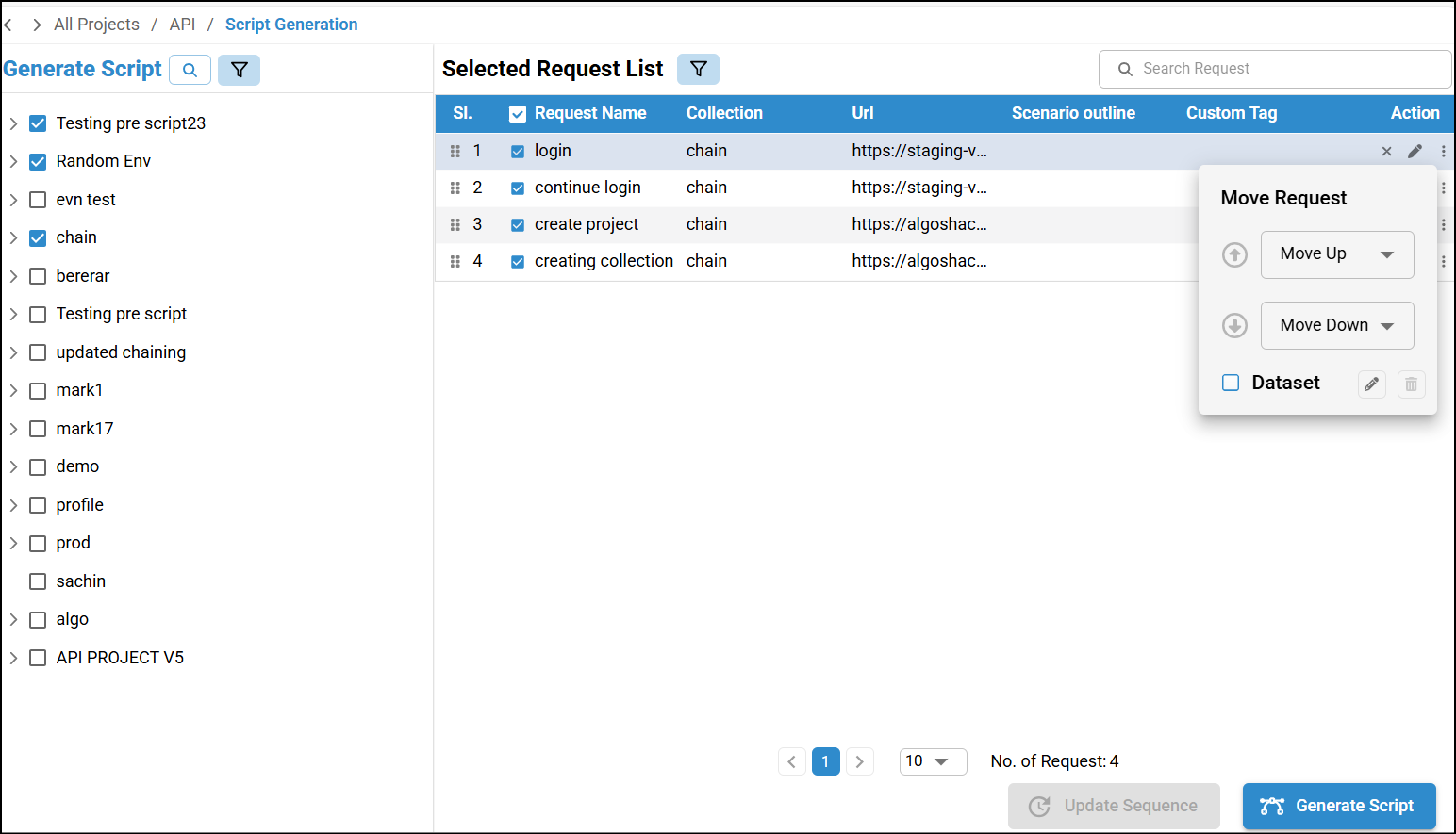 In the API generate script screen, Once you select a collection by default Selected Request List will be selected, Check Data Set option and click Generate Script. After generating the scripts, click More Menu (