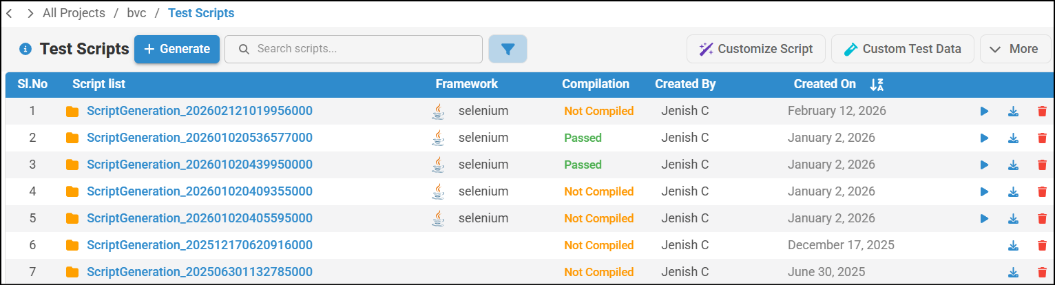 - This page allows you to view scripts along with their framework, compilation status, creator, and creation date and time. From this page, you can also execute, download, or delete the scripts.