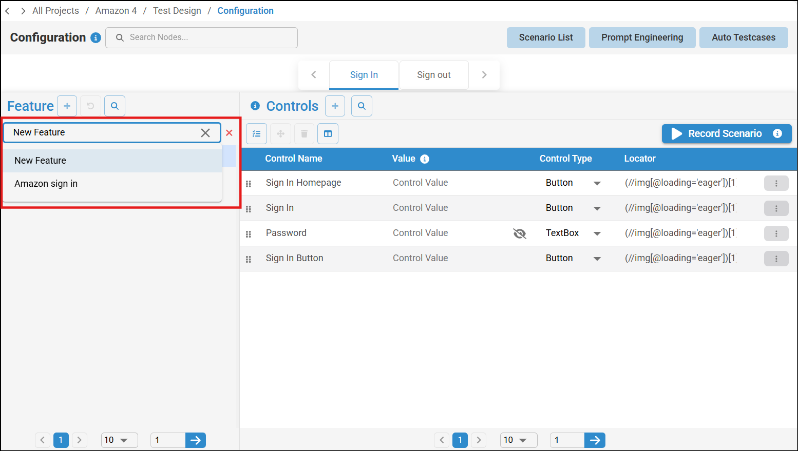 - Select the required feature ( Amazon sign in ) and the Node (Sign In) to view all the added UI element details and then arrange all the UI elements in a sequence. For example, if you were performing a Login process, you will select the all the UI elements related to this process in a sequence, such as username, password and Sign in button. You can search for a particular UI element in the Search Control bar.
