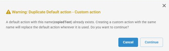 Note: If a user creates a custom action with the same name as an existing default action, the system displays a warning message saying A default action with this name already exists. Creating a custom action with the same name will replace the default action wherever it is used. Do you want to continue?. Continuing will replace the default action with the custom action in all existing configurations.