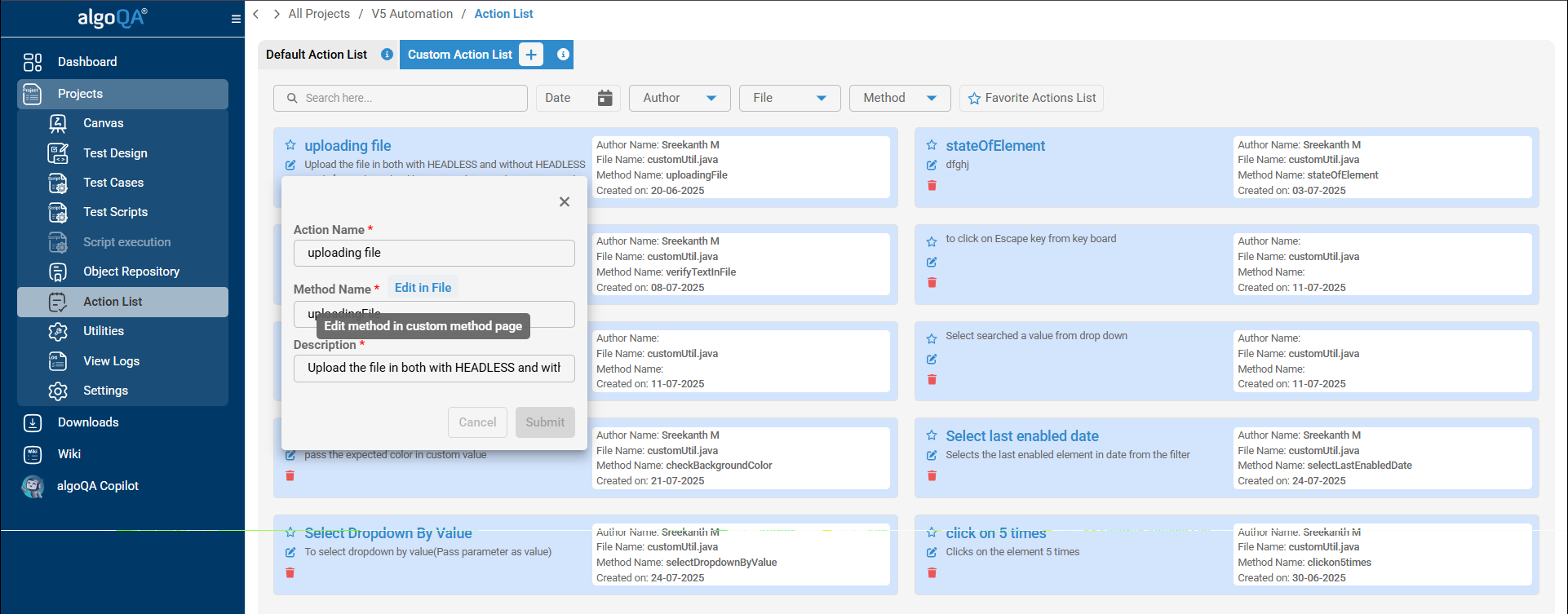 Custom actions provide flexibility to extend the functionality of algoQA. You can import your existing methods into algoQA and use them as custom actions to enhance your automation capabilities.