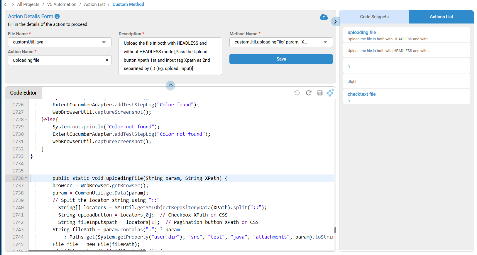 In Action Details Form call the file name which is created or you can also upload the customutil file by clicking Upload file on File Name dropdown and, enter action name, method name, description and click on Save.