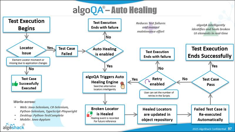 For example, if there are 10 test cases being executed and the second one fails due to a locator issue, auto healing will be triggered only after the 10th test case has been completed. In this case, retry mechanism is used only to rerun the second test case.