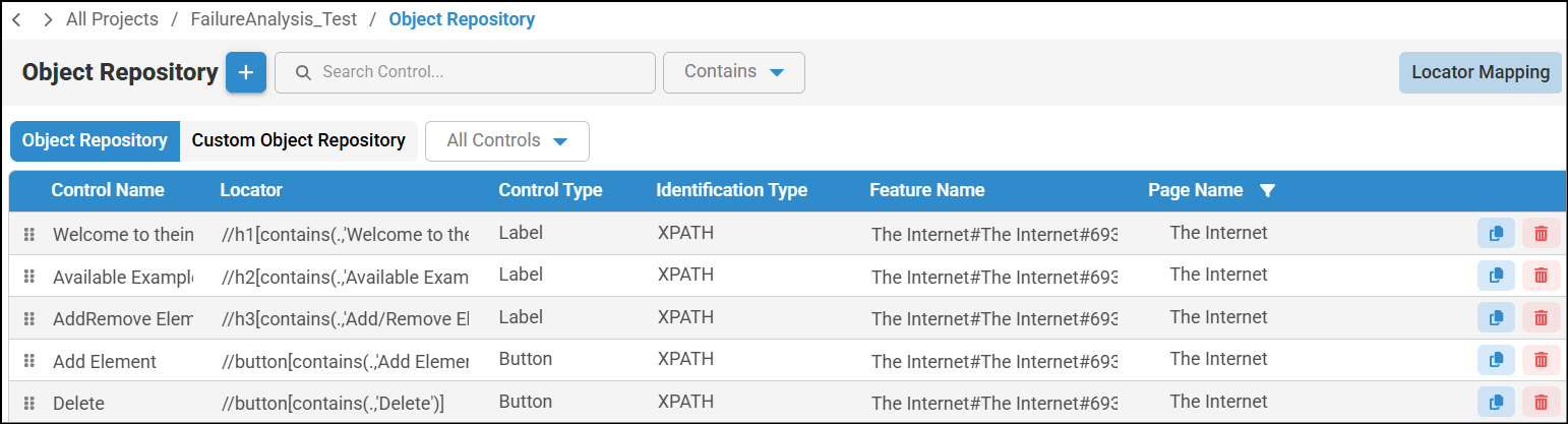 The Locator mapping feature is specific to the UI elements name, type, and XPath expression. For example, when multiple controls share the same UI element name but different XPaths or UI element types, and if you map an XPath to one of these UI elements in the Locator Mapping feature, the XPath will be updated for that particular UI element with its specific UI element type and XPath. The XPaths of other UI elements with the same name but different XPath expressions or UI element types remain unchanged.
