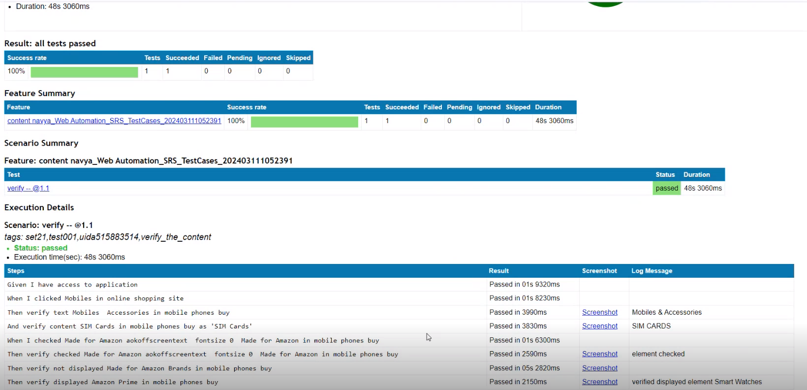 - Build success message will be displayed and you can view the respective report with the log messages for Verification steps, as follows: