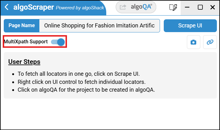 The algoScraper tool, available as a Chrome extension, serves the purpose of capturing all User Interface (UI) elements and X-paths present on a web page. To integrate this tool into your Chrome or Edge browser, Click here.