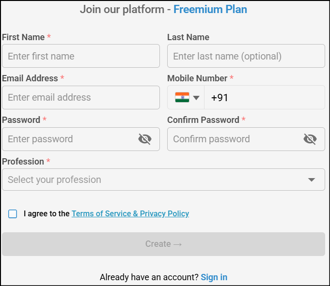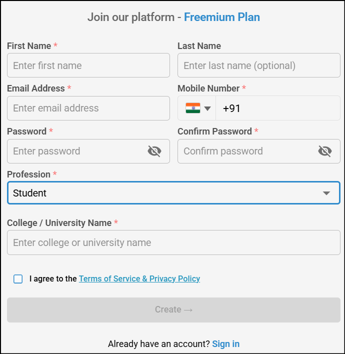 Perform the following:In the Sign up for Freemium page, enter the required details (First Name, Last Name, Email, Password, Country code, Mobile number) and Choose Working Student option from Select your profession drop down list.