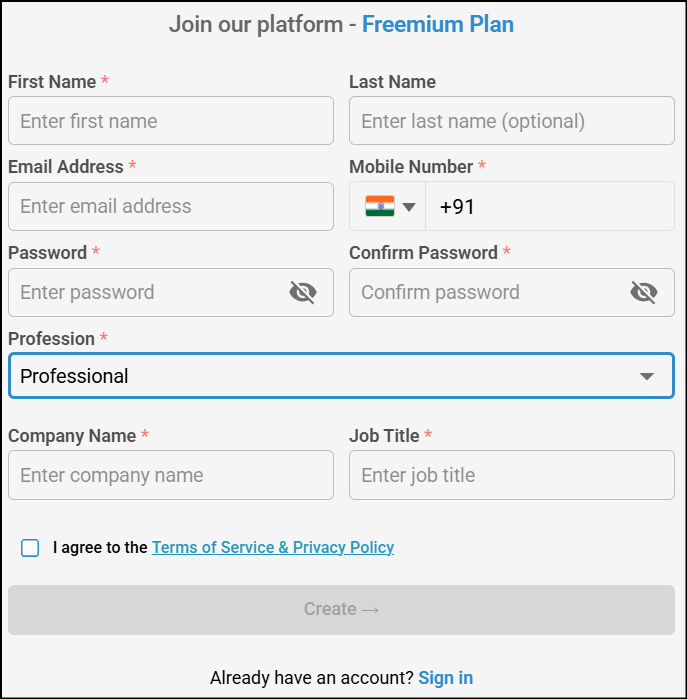 In the Sign up for Freemium page, enter the required details and Choose Working Professional/Employee option from Select your profession drop down list.