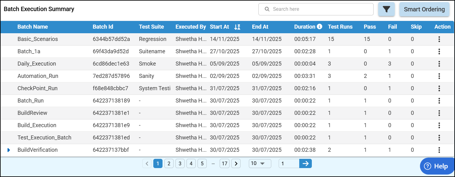 The representation of test cases executed in batches is displayed in a tabular format. Each line item includes the Batch execution name, the Batch ID, which is a unique identifier for the generated report, Test Suite name, the name of the person who executed the test case, the start date of the test execution, the end date of the test execution, the time taken to execute the test cases in seconds, Test Runs and the numbers of passed, failed, and skipped test runs. You can select pagination option for navigating through multiple pages of results. If you have executed the test cases in batches, then those files are combined with the same tags. These combined line items cannot be deleted, it can only be downloaded. Where as, the single batch file can be deleted and downloaded. You can perform these actions by selecting More Menu (3 dots) option in the Action column. You can view the individual report in the PDF or Extent report format by selecting the View Spark Report and View PDF Report options from More Menu in the Action column. You can search for a particular batch execution details by providing the required 'Batch Name', Batch ID and 'Executed by' options. You can also Smart Order the executions by clicking on Smart Ordering, To know more click on Smart Ordering.