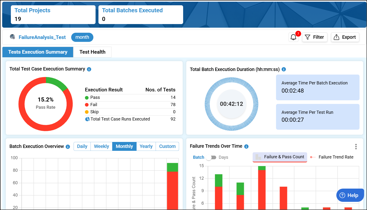 Dashboard helps you to view Test Execution Summary. It provides a structured view Execution Summary. You can filter by timeframe and export the report.