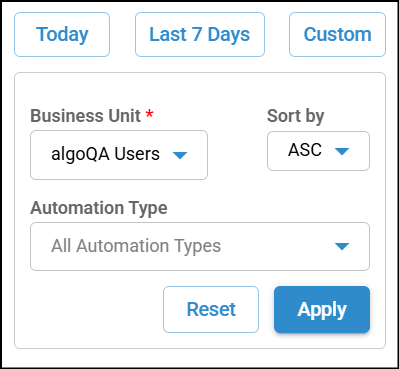 Available filters include Today, Last 7 Days, or a Custom date range, along with Business Unit, Automation Type, and sorting options in ascending or descending order.