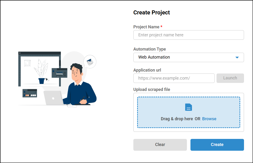 - In the Create Project window, enter the project name, select the automation type and click Create Project. Ensure that the project name must be at least 2 characters.
