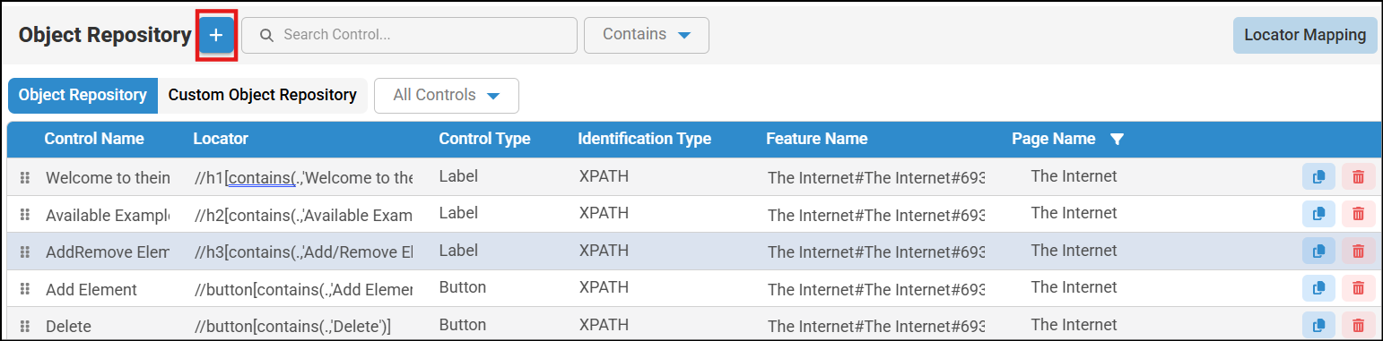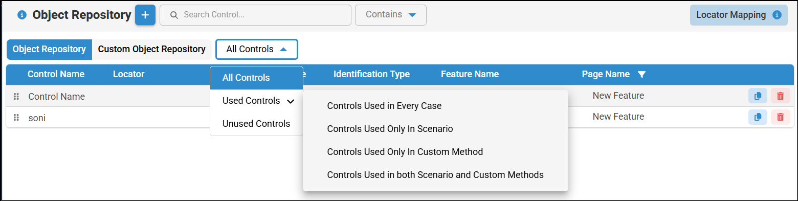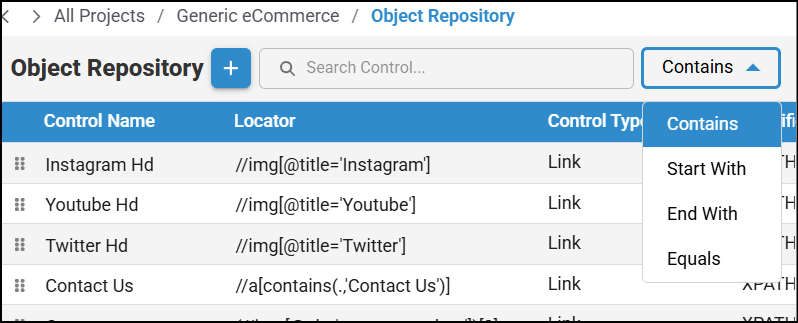 - When working with a large number of controls, you can use the filter and search options to quickly find a specific control. You can filter by Contains, Starts With, Ends With, or Equals, then enter the desired value in the search bar to view results based on the selected filter.