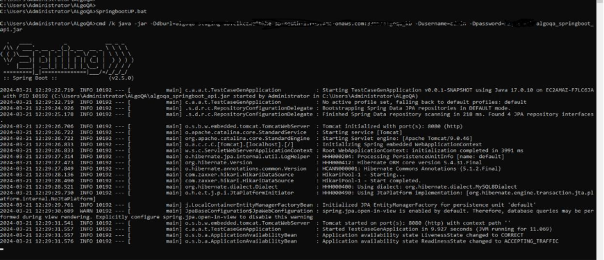 - Update the SpringbootUP.bat file with the client database details Inside the AlgoQA folder: