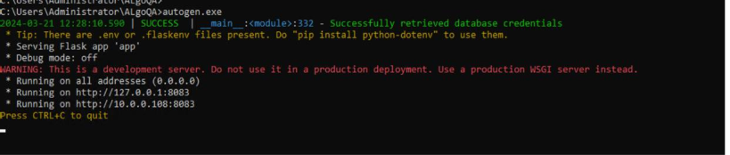 - Start the AlgoQA Python application in the third command prompt: Run the following command: autogen.exe