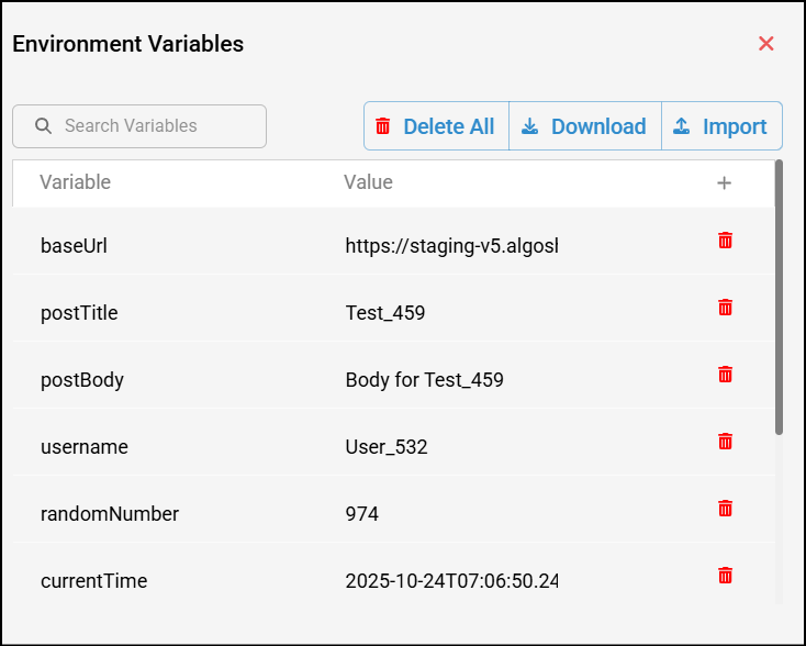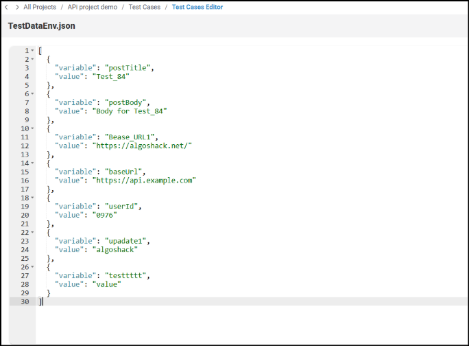 - A separate file named TestDataEnv.json is generated in the Test Cases screen which lists all the provided environmental variables at one place.