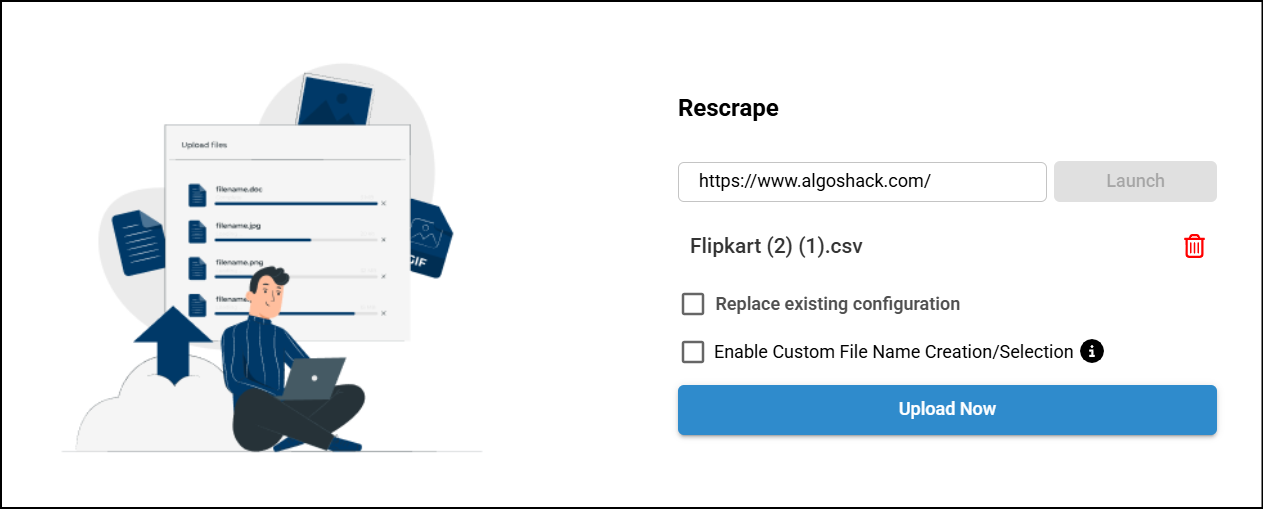 - In the Upload scraped file pop-up window, Click Upload Scraped File to browse the scraped file in the CSV format. Note that if you wish to replace the configuration file, then you can enable the Replace existing configuration check box.
