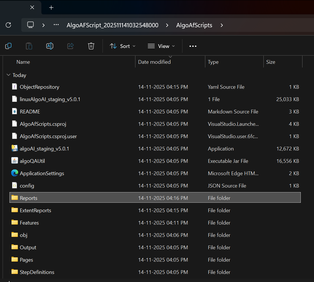 Example of a path to reports looks like this C:\Users\Admin\Downloads\ScriptGeneration_202511141032548000\AlgoAFScript_202511141032548000\AlgoAfScripts\Reports