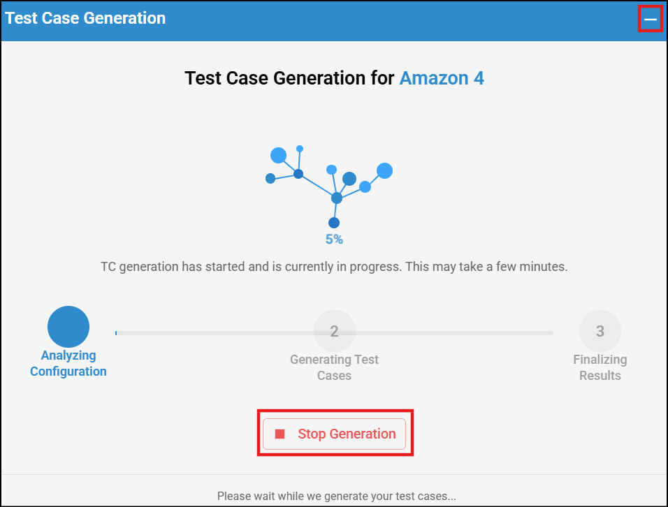 - A Test Case Generation pop-up will appear, allowing you to monitor the progress. You can stop the generation at any time by clicking Stop Generation. If needed, you may minimize the pop-up by clicking Minimize, and restore it by clicking Maximize.