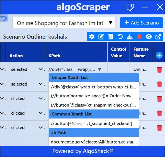- While recording scenarios, the XPath column will display a dropdown menu where you can select the desired locator type. The available options are Unique XPath, Common XPath, and JSPath.