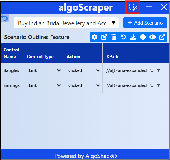 Icon Description Edit Scenario You can view the recorded scenario in a new page. Delete Delete all the UI elements added Reset Reset the UI elements section to default state Download Download the Recorder scenario in CSV and TXT format. Start Recording By default, this icon will be enabled for you to record the scenario. You can stop recording at any point of time by clicking this icon. View Scenario You can view the recorded scenario in a different page. Create a Project As a user, you can navigate to the Project Page using this button after recording a scenario. - You can click the Add Scenario button to create a new scenario.