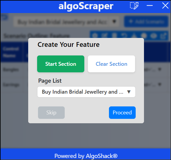 - Record Scenario window appears. In this window, the page will entered automatically, enter the fields like scenario name, scenario outline and click on Start Recording button.