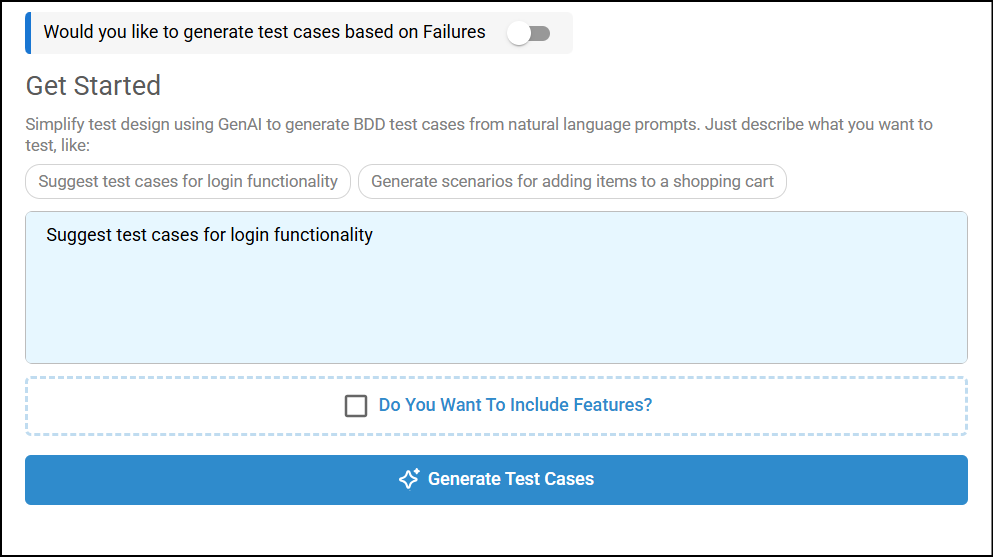 You can select features from the left pane, which helps to generate more refined test cases. click on Generate Test Cases; the platform will then automatically generate test cases in BDD (Behavior-Driven Development) format.