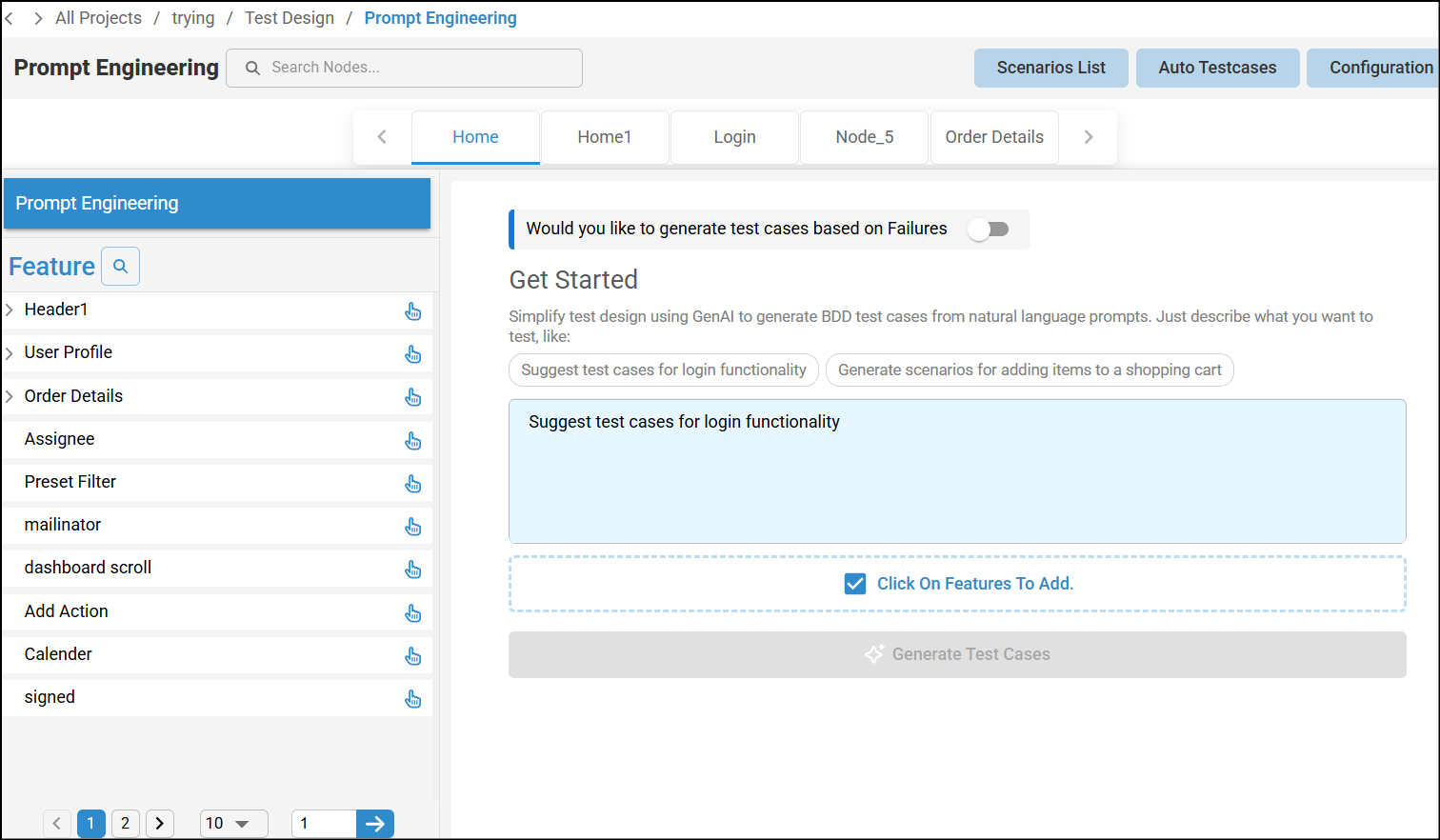 To generate test cases using the prompts, start by creating a new project. To know more about how to create a project access Creating a Project. After the project is created, add nodes to the canvas as required. Clicking on a node will open its configuration and you can add features and controls as required. From there, select the Prompt Engineering option from top to generate test cases using prompts. Enter your prompt, select "Do You Want To Include Features?" checkbox to view the features and Nodes associated with the Project.