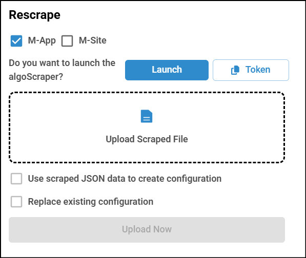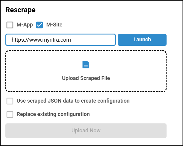 Select M-Site Checkbox, Enter the target URL in the Application URL field, and click Launch.Note: If the algoScraper extension is not installed or is not the latest version, a pop-up will appear prompting you to download or update the scraper.