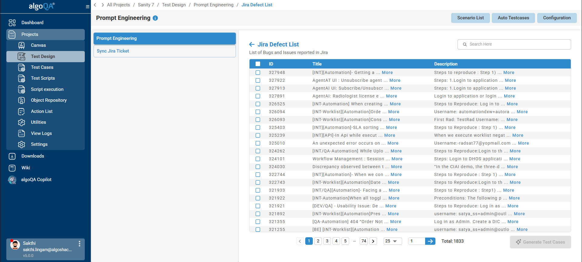 - Once integrated, all defects logged in JIRA will appear on the Prompt Engineering screen.