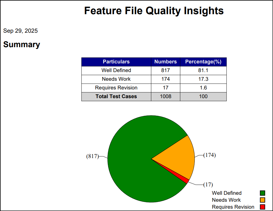 A report will open, displaying a summary with numbers and percentages of test cases categorized as Well Defined, Needs Work, or Requires Revision based on the Given-When-Then (GWT) steps. The summary also includes a pie chart for visual representation. This report can be downloaded for further analysis.