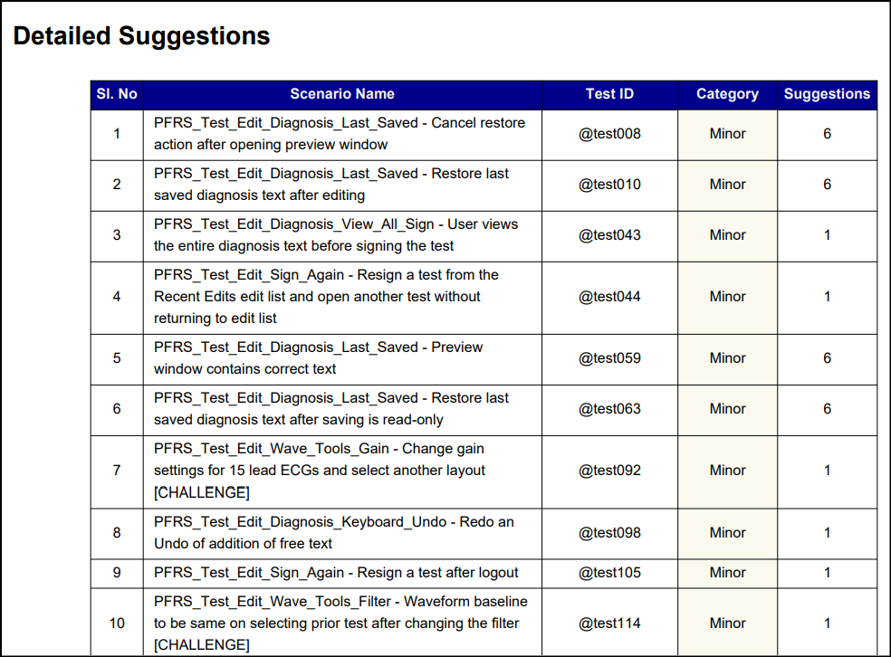 A Detailed Suggestions table is also provided, which includes the Scenario Name, Test ID, Category (indicating whether the issue is Major or Minor), and specific suggestions for improvement. Each suggestion is represented by a number from 1 to 9, with each number corresponding to a unique recommendation and it shows based on the number of test cases.