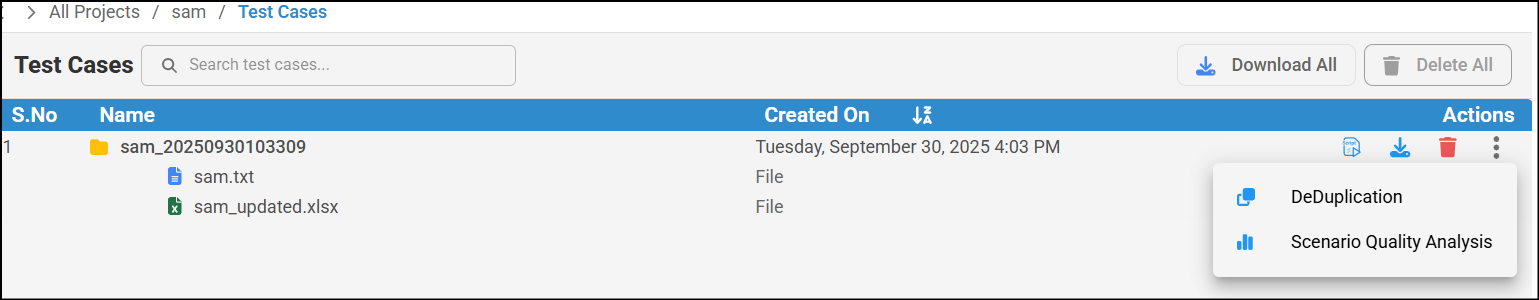 Navigate to Test Cases and click on more icon(3 dots) besides a generated test case, click on Scenario Quality Analysis. You can select a Feature File and evaluate the quality and you can also use multiple feature files together to evaluate the quality, The analysis checks whether the BDD steps are in the correct order, if validations are used appropriately, and whether example tables are included where necessary.